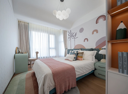 兒童房設(shè)計,在全屋定制柜體里融入橙色點綴。夢幻造型的氣球燈,簡潔舒適。墻面貼上彩色壁紙裝飾,原木紋理的木地板搭配上不同色彩的地毯,使兒童房充滿五彩斑斕。