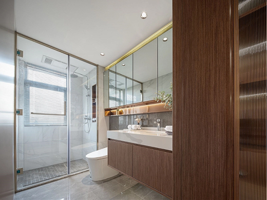 衛(wèi)生間設(shè)計,淋浴區(qū)與洗漱區(qū)做干濕分離設(shè)計,浴室柜與浴室鏡設(shè)計為一體,設(shè)計燈帶滿足局部照明。