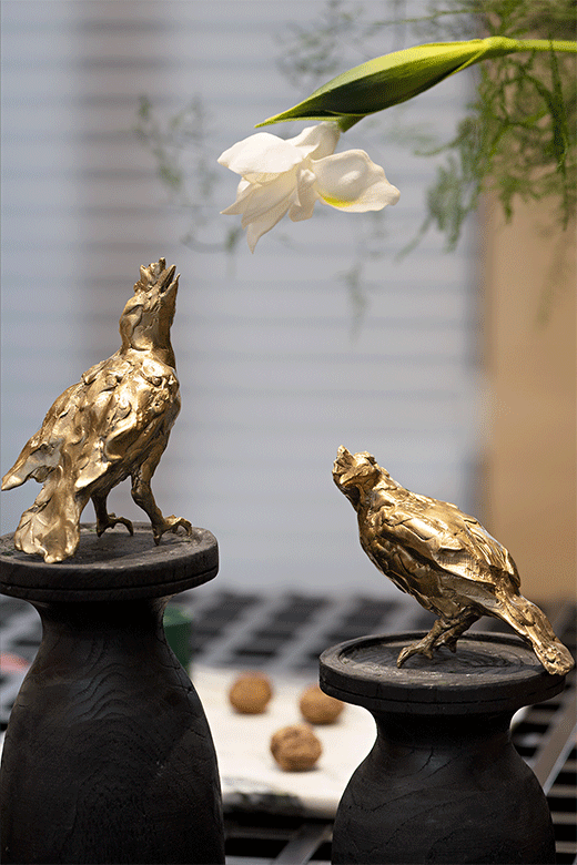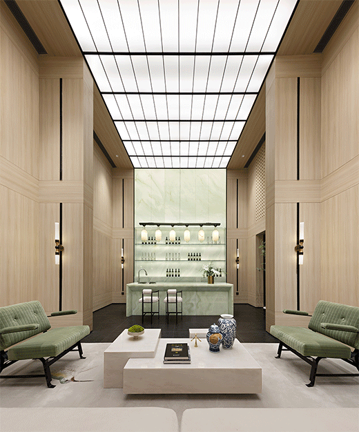 渾然天成的翡翠綠大理石,鋪陳水吧臺(tái)與展示架自然靈動(dòng)的樣貌,厚重的體量感使其呈現(xiàn)雕塑般的美感,細(xì)膩的肌理表達(dá)空間的寧?kù)o與悠遠(yuǎn) ,自然的藝術(shù)在此發(fā)揮的淋漓盡致。