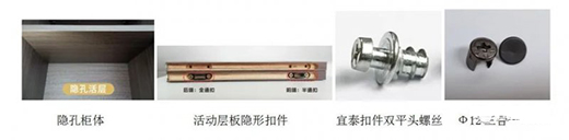 宜泰專注全屋定制,堅持專精特新,自行開發(fā)“隱孔柜體”配件,定制家具柜體頂?shù)装迨褂眯滦艇?2三合一,頂板向上、底板朝下。高度1200mm至1800mm柜體的活動層板內置全通扣與半通扣,直接推進柜體卡住側板上的“宜泰卡扣雙平頭螺絲”,牢固拉緊兩側。安裝簡單方便,安裝后縫隙嚴密,同時可以重復拆卸,確??梢暶婵床坏桨寮B接配件。
