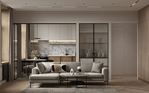 開放式廚房因?yàn)榫邆涓叨鹊目臻g連通性,其整潔與否會(huì)影響到廚房的整體顏值,而廚房的物件多且雜,因此在收納上,建議多采用封閉式收納,吊柜+地柜的組合一般已能滿足基本的收納需求。