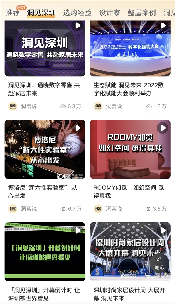 繼去年強勢亮相并收獲行業(yè)關注之后,今年,家裝家居數(shù)字化產(chǎn)業(yè)服務平臺洞窩將攜“洞見深圳”項目再次高調(diào)登場,以現(xiàn)場直播、趨勢解讀、原創(chuàng)視頻、深度圖文等不同形式,與行業(yè)品牌、大咖設計師、專家學者等展開對話。同時,將目光瞄向智能家居和原創(chuàng)設計等熱門領域,助力其在數(shù)字化時代“智”勝未來。