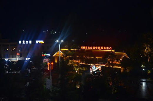 遠(yuǎn)眺整個東山集鎮(zhèn),紅色的路燈串成了一條碩大的紅色“項鏈”,蔚為壯觀,一些高大、標(biāo)志性建筑上的燈條彩帶簡約地勾勒出了建筑的輪廓及整個集鎮(zhèn)的風(fēng)貌,夜晚燈光的點綴讓東山儼然成了一件立體浮雕工藝品。