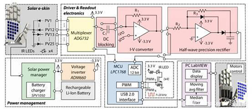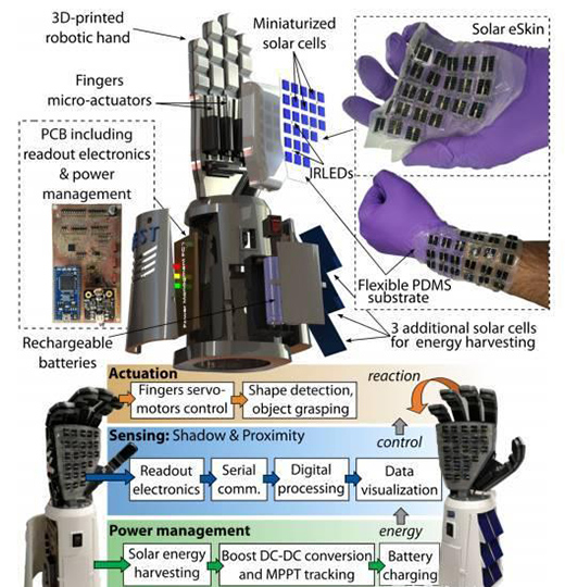 柔性太陽能eSkin及其主要部件概述。集成在三維印刷機械手上。方框圖顯示了這三個子系統(tǒng):感應(yīng)(陰影和接近模式)、電源管理和啟動。