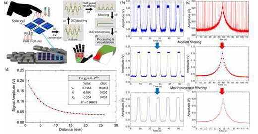 子系統(tǒng):1)電源管理;2)傳感;和3)驅(qū)動。這個傳感子系統(tǒng)由小型太陽能分布式陣列組成。電池和紅外(IR)發(fā)光二極管(LED)集成在軟以及柔韌的PDMS基板,最終放置在手掌中一個3D打印機器人手(圖1)。設(shè)計細(xì)節(jié)