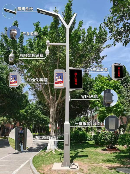 ▲通士達多功能智慧燈桿包含了照明系統(tǒng)、充電樁、信息發(fā)布屏、一鍵報警等多項功能。