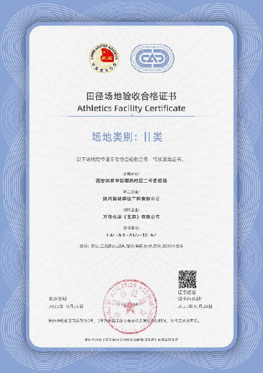 西安體育學(xué)院鄠邑校區(qū)橄欖球場地塑膠跑道工程由一號田徑場和二號田徑場兩條400米標(biāo)準跑道組成,是國內(nèi)少有的雙塑膠跑道工程。萬華化學(xué)提供塑膠跑道系統(tǒng)解決方案,為該項目提供全生命周期的專業(yè)保障。項目驗收現(xiàn)場,中國田徑協(xié)會專家組對塑膠跑道面層厚度、平整度、坡度、粘接牢固度、畫線數(shù)據(jù)、細節(jié)處理逐一嚴格檢測,對比檢測報告中原材料及成品的化學(xué)性能及物理性能指標(biāo),各項檢測結(jié)果均優(yōu)于現(xiàn)行最新國家標(biāo)準。 經(jīng)過專家組標(biāo)準規(guī)范的檢查,一號和二號田徑場均達到Ⅱ類場地驗收標(biāo)準,榮獲中國田協(xié)Ⅱ類田徑場地認證。