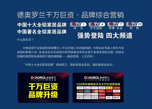 德奧羅蘭:CCTV四大視頻展播品牌、“中國(guó)十大全鋁家居品牌”之一,積極響應(yīng)《健康中國(guó)行動(dòng)》國(guó)家重大戰(zhàn)略,旗下的“鋁創(chuàng)經(jīng)典”為國(guó)人的健康家居生活謀安“醛”,通過(guò)打造全屋全鋁家居制定,讓萬(wàn)戶千家擁有“健康安醛·綠色環(huán)?!钡募揖由?