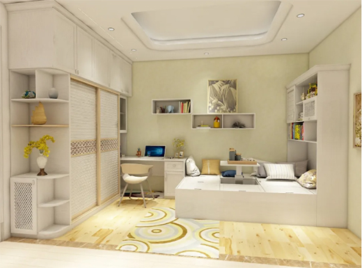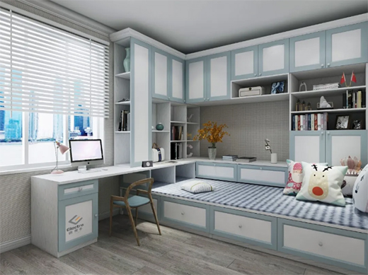 配上書柜的全鋁榻榻米收納力一發(fā)不可收拾,妥妥的裝下全家藏書外,還能任性的擺放各種藝術(shù)品,滿足你可以住人又想要書房的小愿望。