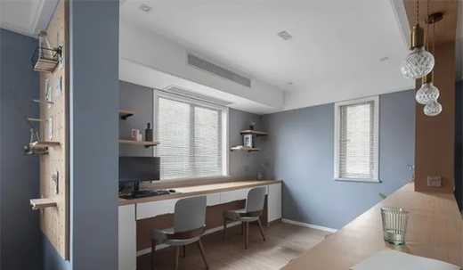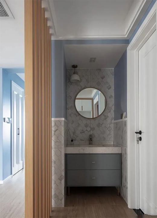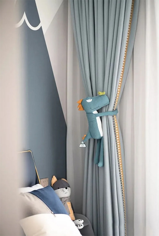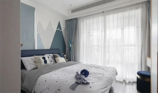 冰川灰的冷白調(diào)和維多利亞藍讓這間兒童房有一種清新的感覺,適合睡眠和學(xué)習(xí)。背景墻打造定制的精致感圖案,一個深藍色抱枕與玩偶以及其他細小的筆觸一起為空間增添了童心,并散發(fā)出啁啾的生氣。