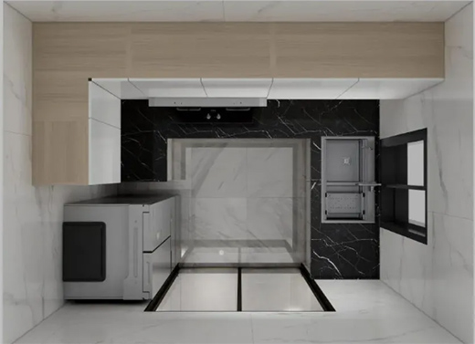 封閉式廚房,整體采用白色柜門,黑色臺面,簡潔大方。廚房面積較小,采用U型布局,使空間利用率最大化,水盆設計位于采光最佳的窗前,便于使用。