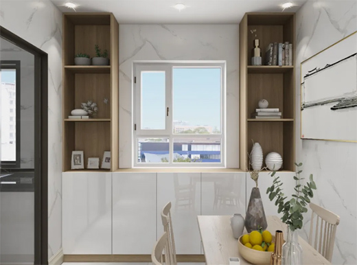 設計餐邊柜可以增加更多的儲物空間,餐邊柜的樣式可根據(jù)自己的喜好進行設計。這個方案由于過道狹長,所以將餐邊柜設計于窗前。兩側高柜可以放置更多物品,但對于采光可能有一定的影響,所以,做矮柜也是不錯的選擇!