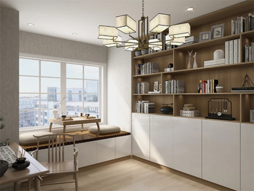 書房根據(jù)其房型,設計了一個飄窗柜,閑暇時間坐在上面喝喝茶,下下棋,聊聊天都是不錯的選擇。