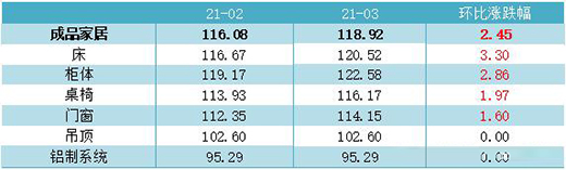 3月,成品家居交易狀況良好,成品家居價格指數(shù)收報118.92點(diǎn),環(huán)比上漲2.45%。細(xì)分品類中,床的價格上漲幅度最大,柜體價格漲幅次之。除吊頂和鋁制系統(tǒng)外,各項(xiàng)細(xì)分品類價格均有上漲。