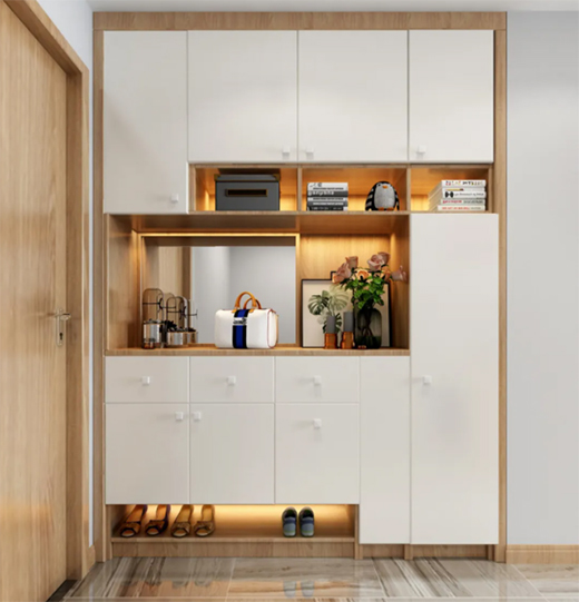 高大玄關(guān)柜能有序收納回家的隨手物品與常穿鞋履,同時(shí)還能懸掛外套,加上穿衣鏡之后完美變身入戶衣帽間。