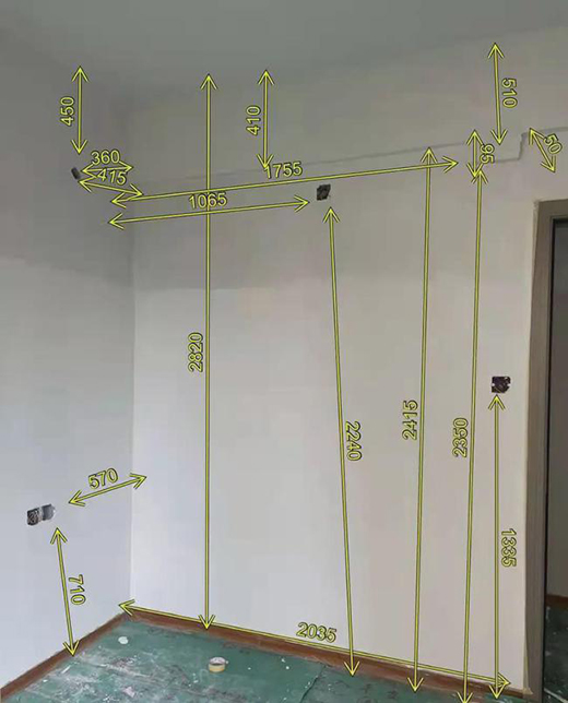 然后,我們從量尺圖開始??梢钥吹?,復(fù)雜的房屋結(jié)構(gòu),也讓量尺出現(xiàn)復(fù)雜的記錄。因此,量尺員需要全面考慮到現(xiàn)場環(huán)境的各個因素,讓尺寸非常精準(zhǔn),才能在后期的設(shè)計制作中事半功倍。