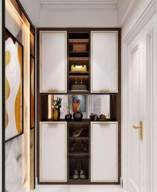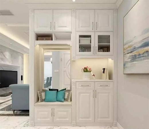 不過,很多人最喜歡的還是包墻設(shè)計,即將全鋁玄關(guān)柜與全鋁櫥柜、全鋁餐邊柜或者全鋁電視柜連成一體,組合型設(shè)計,不僅讓玄關(guān)柜有了更多的開放空間,還可以提高家的整體美感。