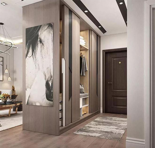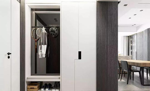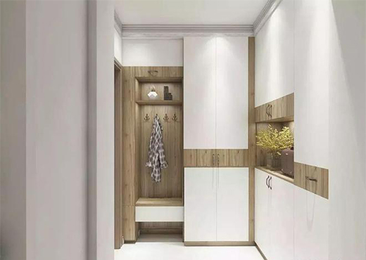 這種情況在小戶型是最常見的,為了避免一覽無余的尷尬感,很多屋主都會選擇設(shè)計一個,垂直于墻面的隔斷柜,來進(jìn)行視線的阻隔,考慮到實用功能,建議鞋柜可以做通頂設(shè)計。