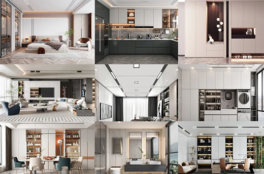 家里面大到衣柜、櫥柜、鞋柜,小到電視柜、陽臺洗衣柜,以及護墻板、吊頂都可以實現(xiàn)同色系搭配,顏值更高。