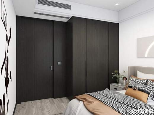 臥室里利用了深色調(diào)的木色搭配中性灰色,讓衣柜顯得更加高級,整個和床頭背景層次錯落,顏色大膽跳躍。