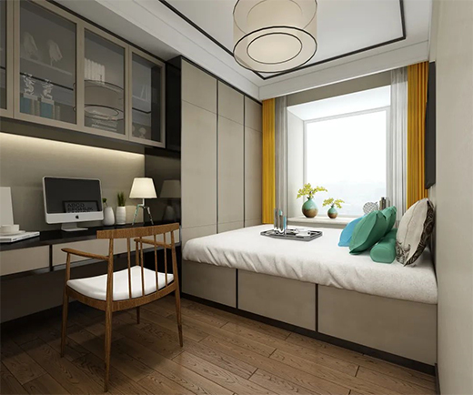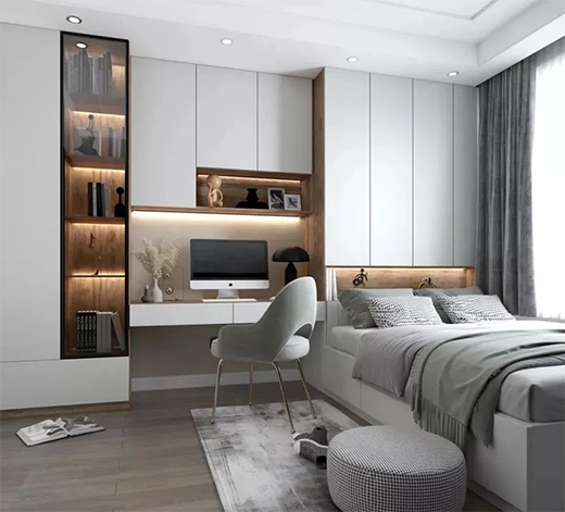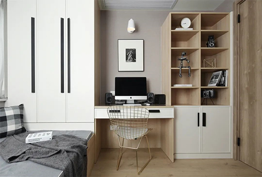 書房區(qū)域,在并不寬敞的空間內(nèi),通過定制的全鋁家具滿足功能及儲物需求,將榻榻米、衣柜和書桌及書柜做了一體化結(jié)合設計,即便是素色空間,卻能讓人感受到溫暖而舒適的愜意生活。