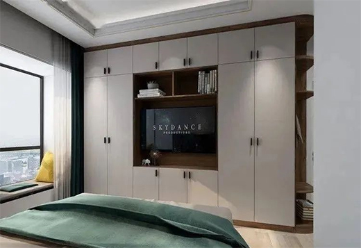 一柜到頂?shù)囊鹿裨陬佒瞪嫌兄鴫旱剐缘膭倮?,防塵效果好,到頂?shù)目臻g還能多收納幾床棉被。