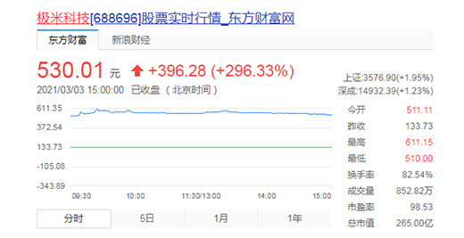 2021年3月3日,國(guó)內(nèi)投影設(shè)備企業(yè)成都極米科技股份有限公司(簡(jiǎn)稱“極米科技”,代碼“688696”)在科創(chuàng)板上市。當(dāng)日收盤,公司股價(jià)報(bào)530.01元/股,較發(fā)行價(jià)133.73元/股上漲296.33%,公司總市值達(dá)到265億元。