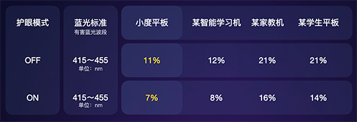 「優(yōu)視藍(lán)」的護(hù)眼效果得到了中科院的權(quán)威認(rèn)證:在小度智能學(xué)習(xí) 平板的護(hù)眼模式下,有害藍(lán)光波段低至7%,低于市面主流的各大品牌智能學(xué)習(xí)機(jī)、家教機(jī)、學(xué)生平板等,護(hù)眼標(biāo)準(zhǔn)刷新行業(yè)天花板。