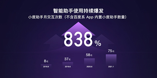 經(jīng)過多年發(fā)展,小度助手已全面升級(jí)至6.0,合作伙伴品牌超過500家,開發(fā)者社區(qū)擁有開發(fā)者超過47000名。截至2021年1月,小度助手月交互次數(shù)達(dá)75億次(不含百度系A(chǔ)pp內(nèi)置小度助手?jǐn)?shù)量),較2018年6月增長838%,使用持續(xù)爆發(fā)。得益于用戶體驗(yàn)的改善,領(lǐng)先的AI能力及自主研發(fā)的芯片,2020年小度智能屏出貨量穩(wěn)居全球市場份額第一,深入千家萬戶,融入人們?nèi)粘I畹母鱾€(gè)場景。