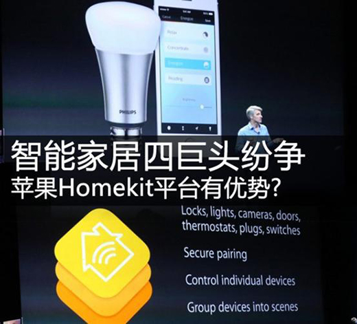 而Homekit的出現(xiàn)加強(qiáng)國(guó)內(nèi)廠商競(jìng)爭(zhēng),促使分散的零碎的資源向大平臺(tái)靠攏,智能家居邁向大眾化市場(chǎng)起到了很大的推動(dòng)作用。而蘋果、谷歌、微軟、三星四大巨頭角逐智能家居,小廠商們只能各自站隊(duì)。