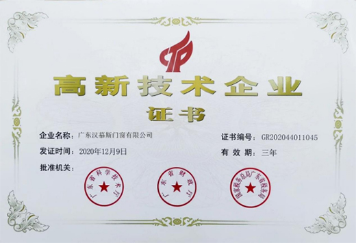 目前,漢慕斯門窗擁有20多項(xiàng)國(guó)家專利,榮獲“中國(guó)十大鋁合金門窗品牌”、“中國(guó)十大家裝門窗品牌”等榮譽(yù)稱號(hào),受到門窗行業(yè)與消費(fèi)者門窗的廣泛贊許與認(rèn)可。在2021年通過(guò)國(guó)家高新技術(shù)企業(yè)認(rèn)定標(biāo)準(zhǔn)的嚴(yán)格篩選,廣東漢慕斯門窗有限公司榮獲“國(guó)家高新技術(shù)企業(yè)”專業(yè)認(rèn)證。