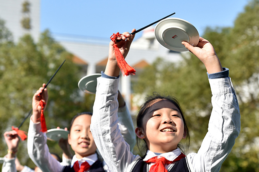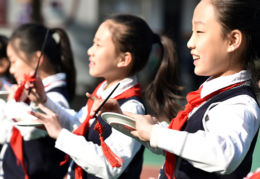 揚(yáng)州市汶河小學(xué)校園藝術(shù)團(tuán)的孩子們?cè)谟每曜雍捅P子作為打擊樂器,表演地方特色非遺項(xiàng)目“揚(yáng)州清曲”。