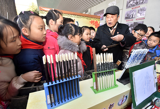 筷子民間收藏者胡學(xué)明老人正在揚(yáng)州市汶河小學(xué)向孩子們介紹筷子的文明使用方法。
