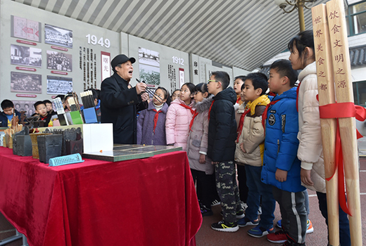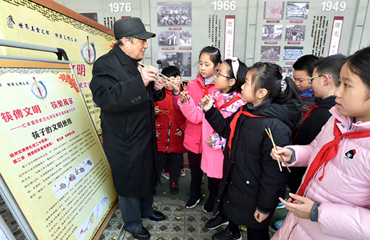 筷子民間收藏者胡學(xué)明老人正在揚(yáng)州市汶河小學(xué)向孩子們介紹餐桌用筷的相關(guān)文明禮儀。