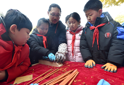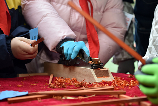 揚(yáng)州市汶河小學(xué)的孩子們?cè)诳牦缥幕?jié)上學(xué)習(xí)體驗(yàn)手工制作筷子的傳統(tǒng)木工技藝。