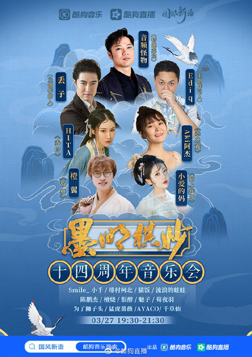 此前,元老級國風(fēng)團隊“墨明棋妙”攜手酷狗舉辦十四周年慶典,為樂迷們打造了一場國風(fēng)盛宴。HITA、小愛的媽、Aki阿杰、緋村柯北、流浪的蛙蛙等人氣墨村成員,以及特邀嘉賓音頻怪物、陳鵬杰等同臺,獻上經(jīng)典金曲Live演繹,并與線上線下觀眾實時互動。
