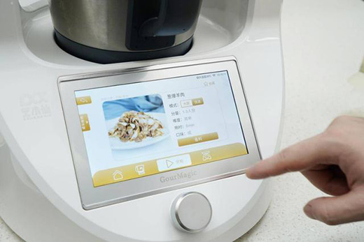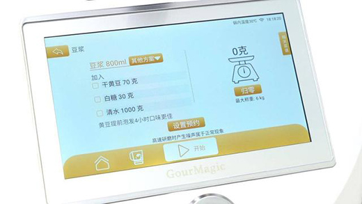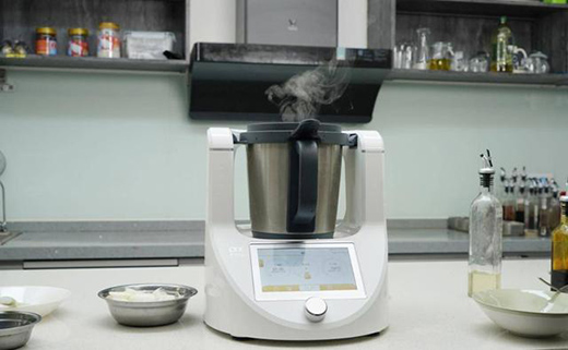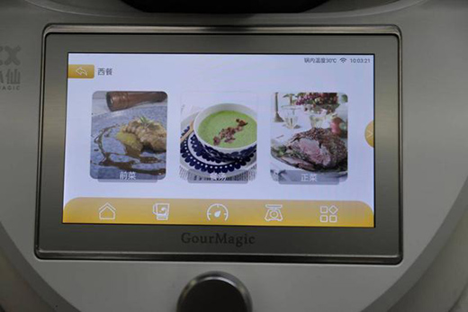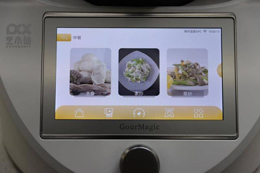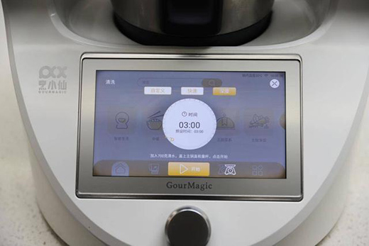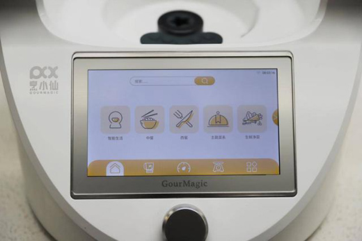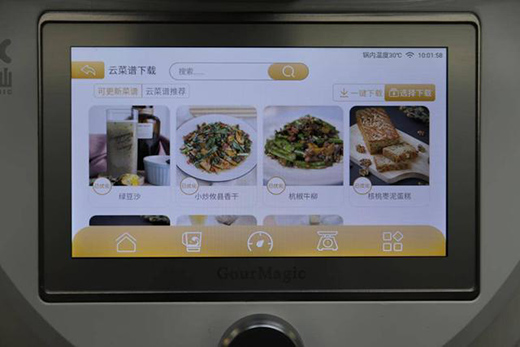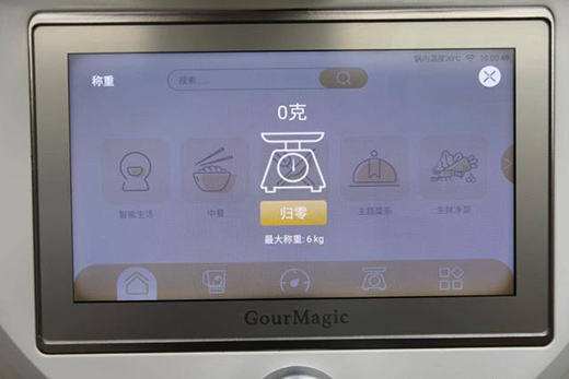 在使用方面其實更多的是通過這塊7英寸高清觸摸屏幕進行,對比同類產(chǎn)品來說,除了顯示屏尺寸更大外,更大的區(qū)別筆者認為是在人機交互方面,整體UI界面的設(shè)計較為扁平化,內(nèi)容分類清晰直觀,上手門檻低,按照筆者體驗來說,無需任何烹飪經(jīng)驗的人,都能很好的操作這款設(shè)備。UI界面主要分為主頁的菜譜烹飪;第二類清洗類,包括機身自洗和生鮮蔬果類的清洗;第二類是烹飪臺,用于手動調(diào)節(jié)轉(zhuǎn)速、溫度,時間;第四類則是稱重功能,對于烹飪方面,除了菜譜烹飪外,對于各種食材、配料的拿捏也做到量化的標準,這點尤為重要、;最后就是常用功能了,比如豆?jié){模式、揉面模式、蒸汽模式等。