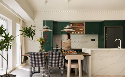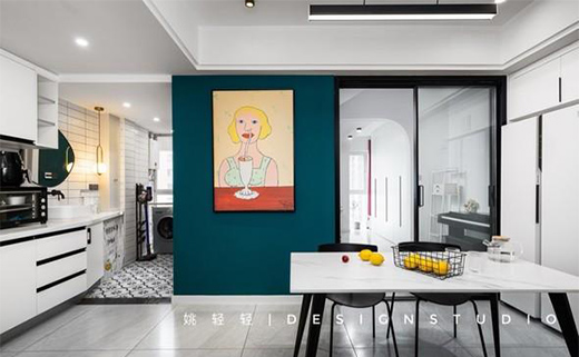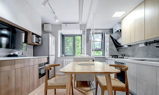 小戶型如何合理規(guī)劃利用有限面積,打造舒適的餐廚空間,也是一個難題。可以嘗試大膽打破以沙發(fā)和電視柜為主的客廳設(shè)計,改以餐桌為中心。餐桌不再單單只是一個吃飯的場地,也變成我們可以坐著休閑聊天和辦公的地方。這樣餐廚一體的開放式設(shè)計,讓空間更加多元化和生活化。