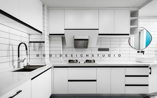 此外,廚房的吊柜設(shè)計也有講究。在我們站著時,抬手能毫無費(fèi)力的拿取東西的高度,再減掉10cm就是最合適的吊柜底部高度。大概是在臺面高度上方的60-70cm的范圍內(nèi)。吊柜的深度要設(shè)計的比地柜淺約20cm左右,不然很容易碰到頭。