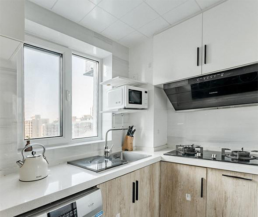 廚房里L(fēng)型廚柜設(shè)計提高了空間利用率,水槽上方規(guī)劃置物架,可放置微波爐等小廚電,讓空間使用最大化。白色調(diào)廚具使廚房顯得清新,配上良好的采光使廚房更加通透。