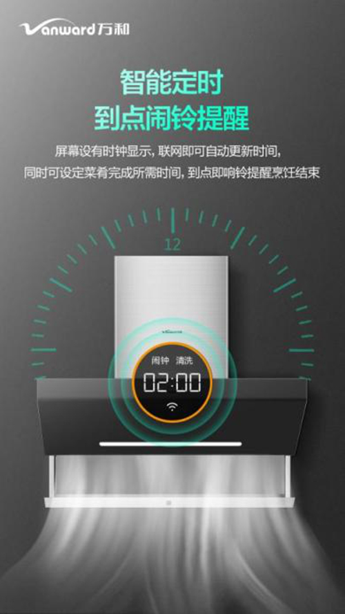 萬和在深挖用戶研究中,在蒸菜與煲湯中一直惦記著時間。萬和智能潛吸煙機(jī)L26T,裝配了智能鬧鐘提醒功能,可調(diào)1-99分鐘定時功能,到點(diǎn)即響鈴提醒,做菜時間更精準(zhǔn),,火候剛好,菜肴更香。