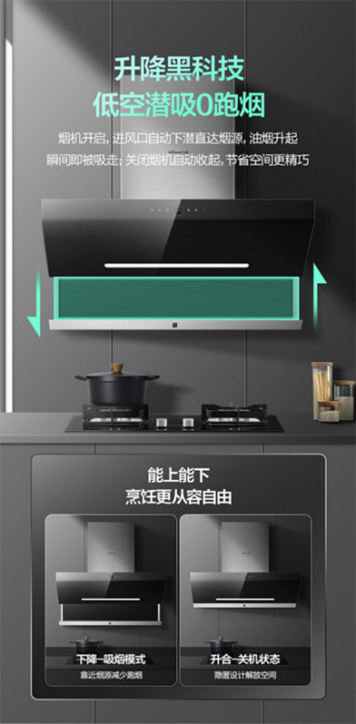 油煙機(jī)的基本功能是吸煙與排煙,萬和根據(jù)油煙不上臉特性開發(fā)了萬和智能升降油煙機(jī),萬和L26T煙機(jī),將吸煙口大幅下探的方式來讓吸煙口離油煙源更近,使吸煙口離灶臺僅有30cm,只有油煙剛產(chǎn)生,瞬間吸走,即使猛火爆炒也不跑煙。同時,該煙機(jī)搭配23m3/min的大風(fēng)量與430Pa大風(fēng)壓雙重強(qiáng)大的性能加持,即使是做飯高峰期也能快速將油煙排出去。