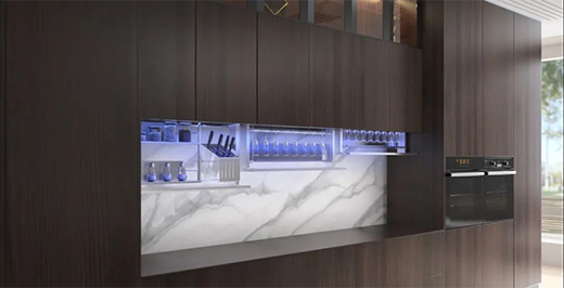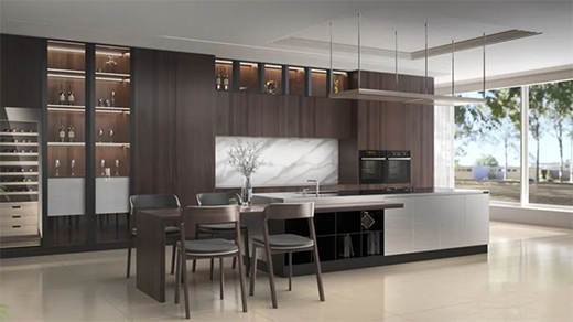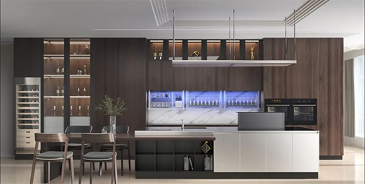靠墻面柜體內(nèi)嵌冰箱、紅酒柜、蒸烤箱,內(nèi)在設(shè)計(jì)抽屜、多功能拉籃、動(dòng)感升降吊柜、玻璃柜等,收納與展示相結(jié)合,實(shí)現(xiàn)空間的層次感。