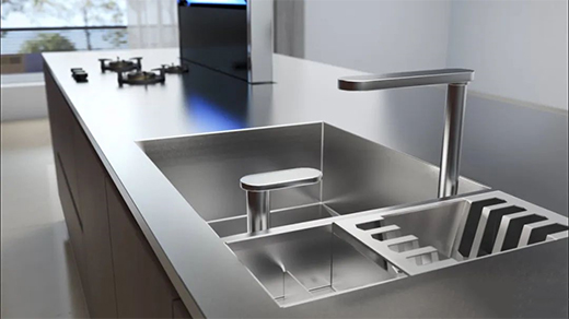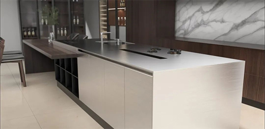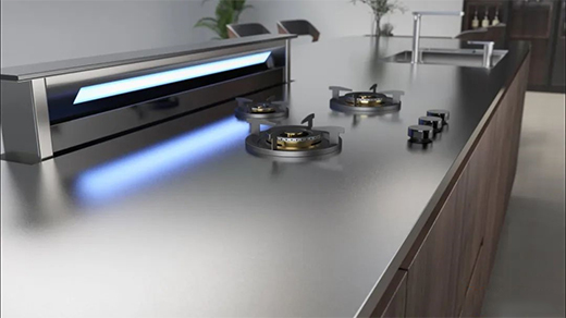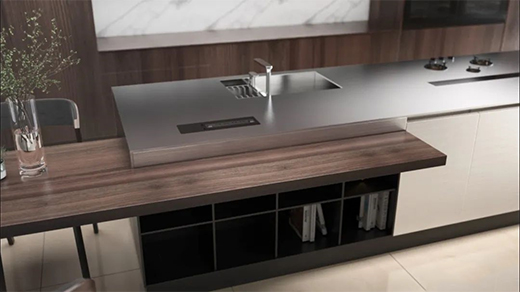 轉(zhuǎn)身便是超長島臺,高低錯(cuò)落,臺面、水槽、燃?xì)庋b置集成一體,無縫對接;電動(dòng)翻轉(zhuǎn)插座、電動(dòng)升降煙機(jī)隱藏其中,將極簡風(fēng)格發(fā)揮的淋漓盡致。