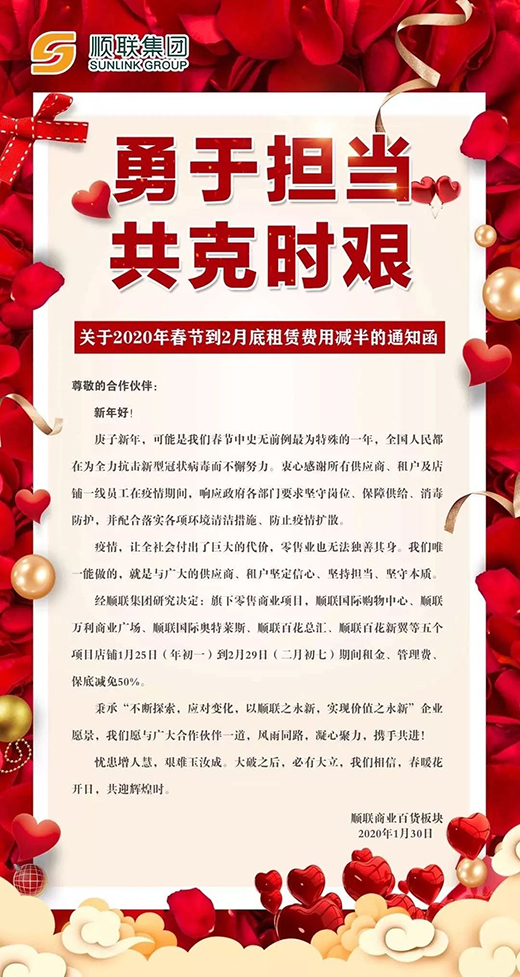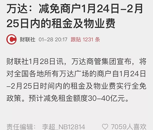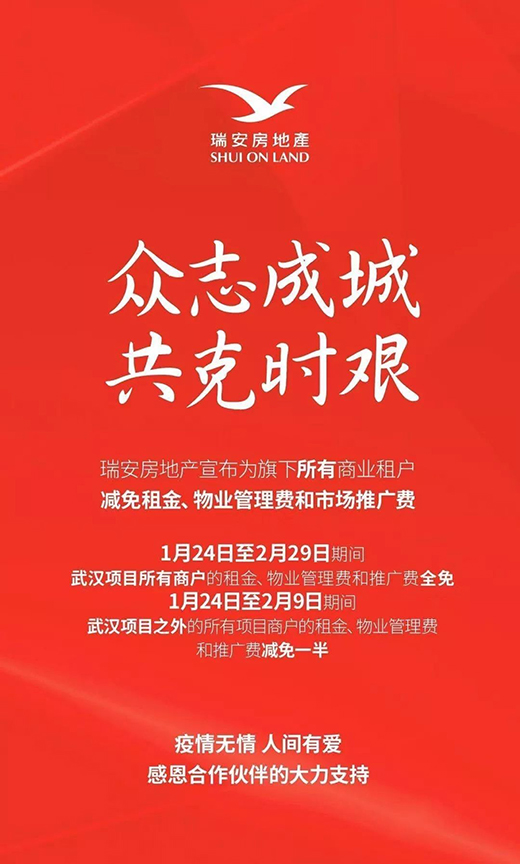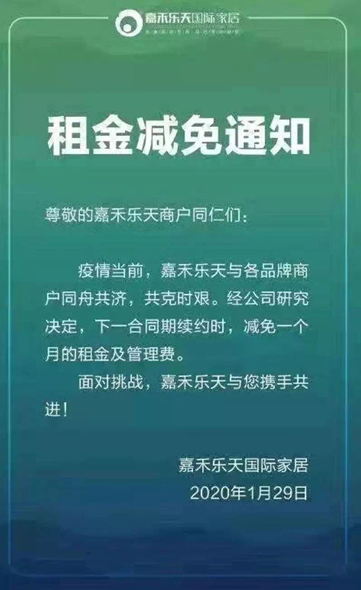 據(jù)媒體報道,考慮到商戶、租戶由于疫情而遭受的經(jīng)濟損失,已有萬達、紅星美凱龍等數(shù)百家百貨、購物中心實施了租金減免政策。據(jù)南方+消息,佛山市的美的置業(yè)、順成·大融城、廣佛智城、南海嘉洲廣場、順德宏匯城、嶺南天地、順聯(lián)集團、佛山萬科等約10家商業(yè)體,均已向本商城或旗下項目發(fā)布了租金減免通知。