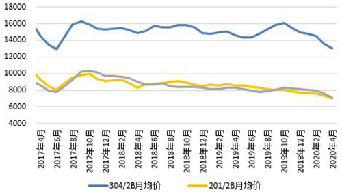 4月,不銹鋼現(xiàn)貨價格整體有所下跌,304、201及430冷軋月度均價環(huán)比分別-4.15%、-4.41%和-6.89%。