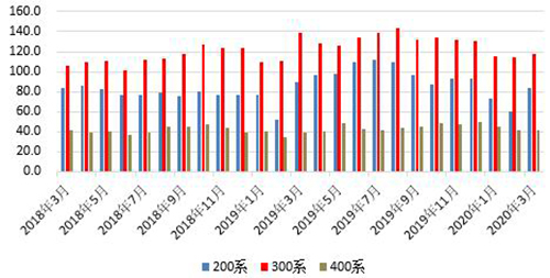 3月份,國內(nèi)不銹鋼產(chǎn)量243.54萬噸,環(huán)比增長12.99%。其中,200系產(chǎn)量84.25萬噸,環(huán)比增長39.53%;300系產(chǎn)量232.94萬噸,同比增長5.84%;400系產(chǎn)量87.30萬噸,同比增長16.65%。