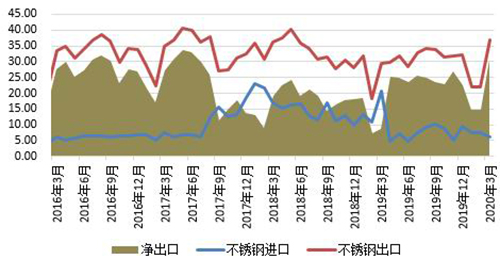 2020年3月,國內(nèi)不銹鋼凈出口量為30.64萬噸,環(huán)比增長109.0%。凈出口數(shù)據(jù)的環(huán)比增長主要是受出口增加而進口下降影響,進口降幅主要來自印尼不銹鋼的下降。