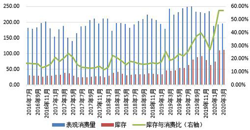 3月份,國內(nèi)不銹鋼商品材表觀消費量為196.78萬噸,環(huán)比增長2.09%。國內(nèi)不銹鋼表觀消費的增長主要是受不銹鋼產(chǎn)量增長而凈出口增加影響。庫銷比的抬升表達的是市場的消費壓力延續(xù)。隨著前期獲利盤到貨的加速,則不排除市場去庫出現(xiàn)放緩甚至小幅上升的可能。