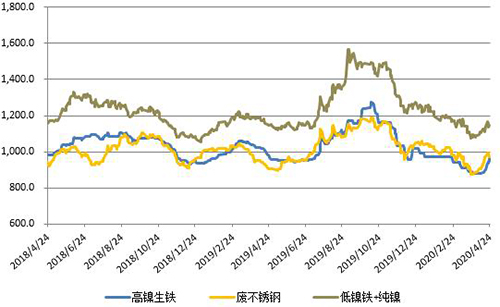 4月份,國內(nèi)鎳原料經(jīng)濟性的順序再度變化,就整體而言各模式之間的經(jīng)濟性關(guān)系整體表現(xiàn)為“高鎳鐵>廢不銹鋼>‘低鎳鐵+鎳板’”,廢不銹鋼的經(jīng)濟再度下降,主要是由于精煉鋼廠與中頻爐企業(yè)的原料爭奪影響,從而帶動其價格的上漲。預(yù)計5月份國內(nèi)廢不銹鋼的經(jīng)濟性將再度凸顯。